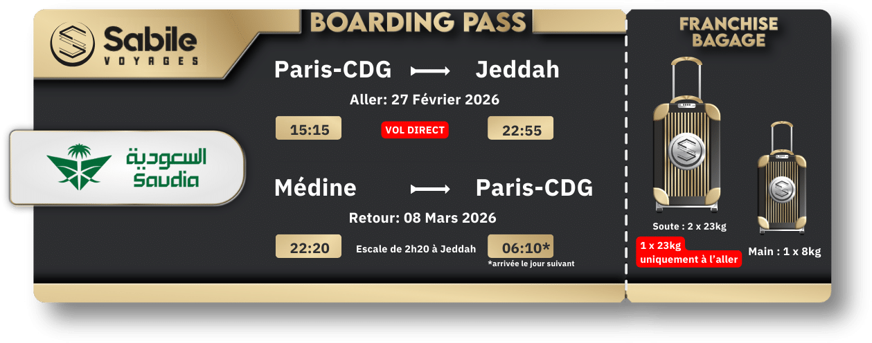 OMRA pendant les vacances scolaires du mois de Ramadan du 27 Février au 8 Mars 2026 Toute l’équipe Sabile Voyages vous accompagnent pour l’accomplissement de votre Omra en toute sérénité, à la lumière du Coran, de la tradition prophétique et de la compréhension des pieux prédécesseurs. Une Omra au départ de Paris CDG Notre équipe, forte de son expérience, organisera au mieux votre séjour afin que vous puissiez vous concentrer sur la chose la plus importante : Vos adorations !